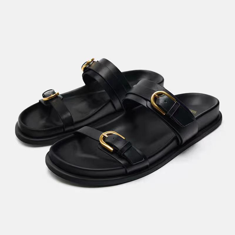 Open toe buckle decorated beach casual flat sandals thick sole strappy slippers