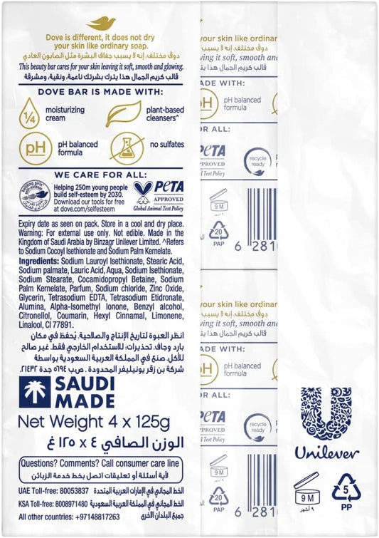 DOVE Moisturising Soap Bar Nourishing formula for all skin types, Original, With ¼ moisturising cream, 125g (Pack of 4)