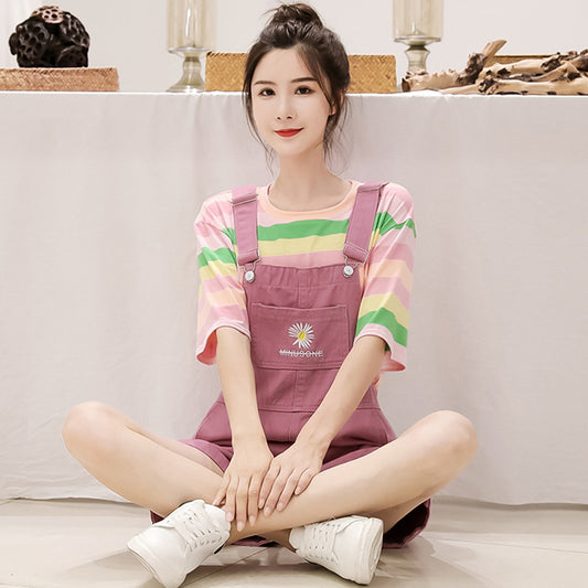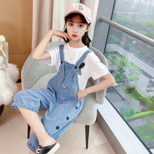 New Trendy White Cotton T Shirt Denim Bib Suit Cotton Girls Two Piece Clothing