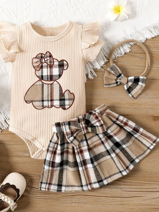 Newborn baby girl summer style teddy bear sticker embroidery bag fart triangle Ha clothes plaid butterfly