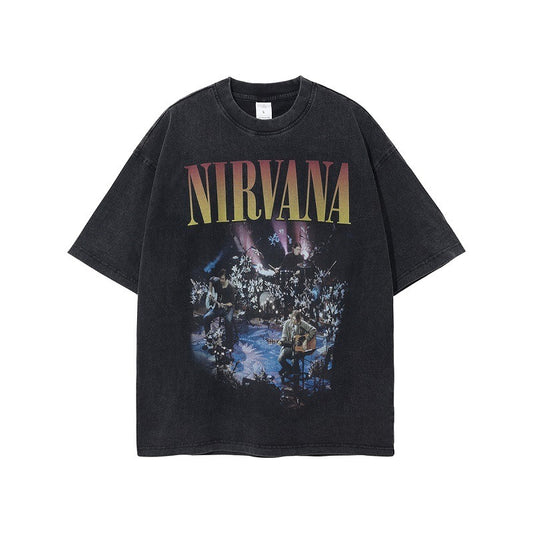 Retro washed and distressed band printed T-shirt for men and women couple Oversize short sleeved