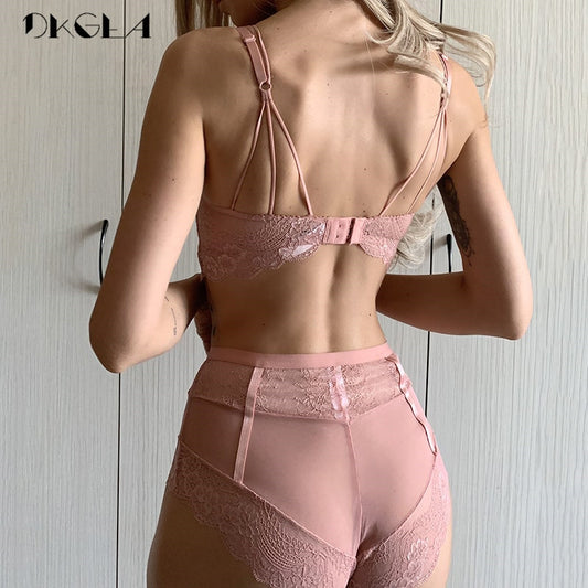 New High Waist Gray Bra Embroidery Lingerie Sets Fashion Brassiere Transparent Black Deep V Lace Underwear Women Bra Set