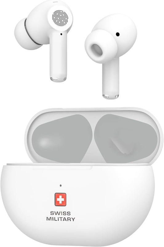 Swiss Military Delta5 Active Noise Cancelling Earbuds with ENC & Transparency Mode, Smart Touch Sensors, 300Hr Standby & 5Hr Music Time, Seamless Connectivity, Works with Android/iOS Phones- White