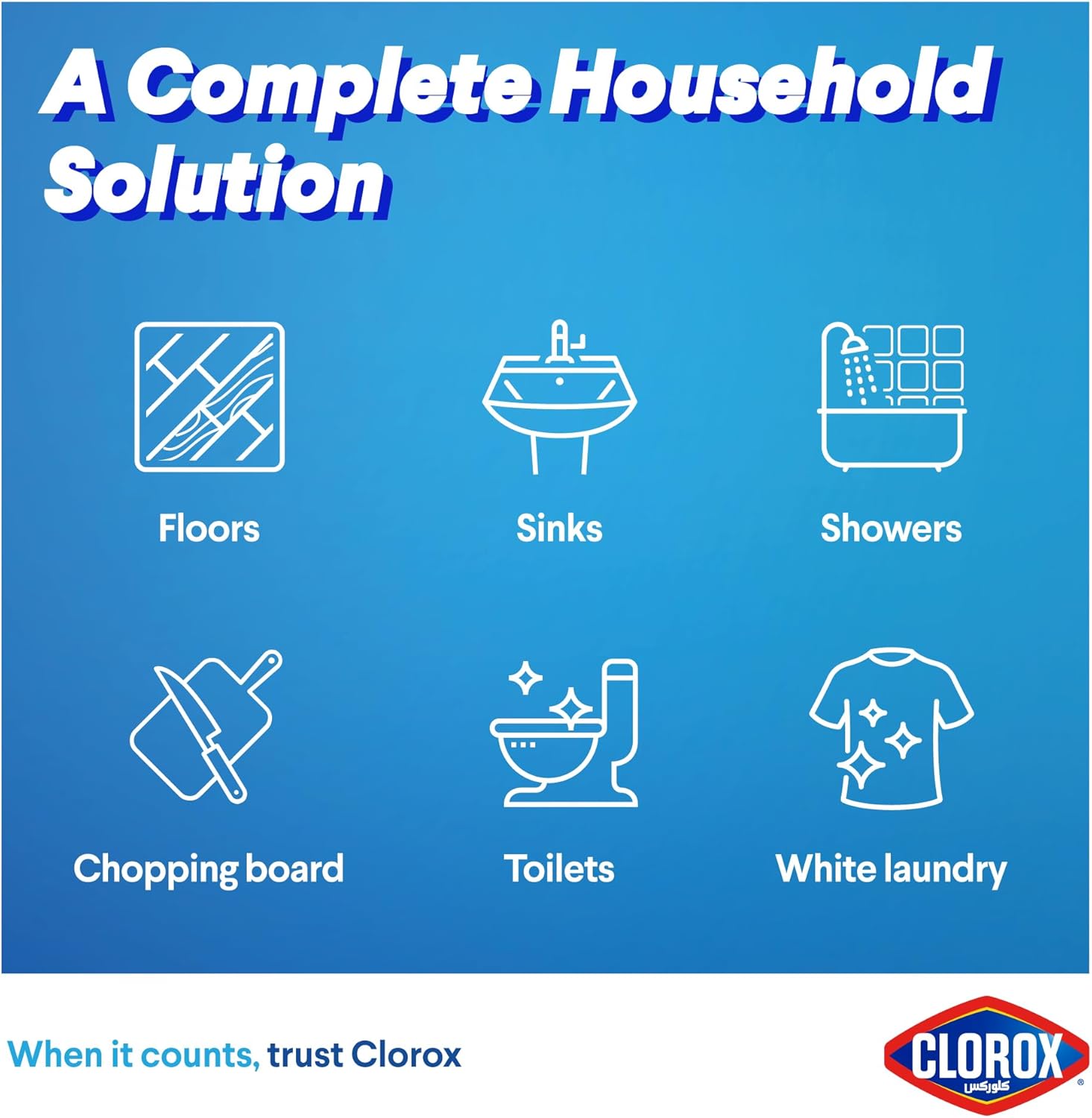 Clorox liquid bleach whitens, removes stains, cleans and disinfects, killing 99.9% of common household viruses, bacterial and fungus.